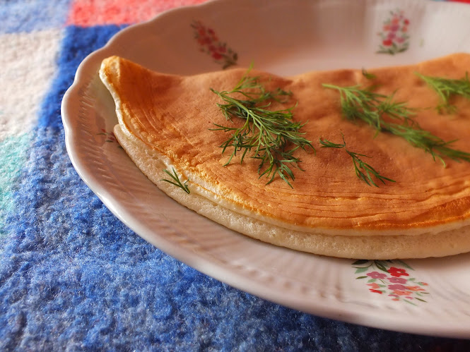 Masę omleta wylewamy na patelnie do smażenia naleśników, bądź inną teflonową, gdzie nie trzeba używac tłuszczu.