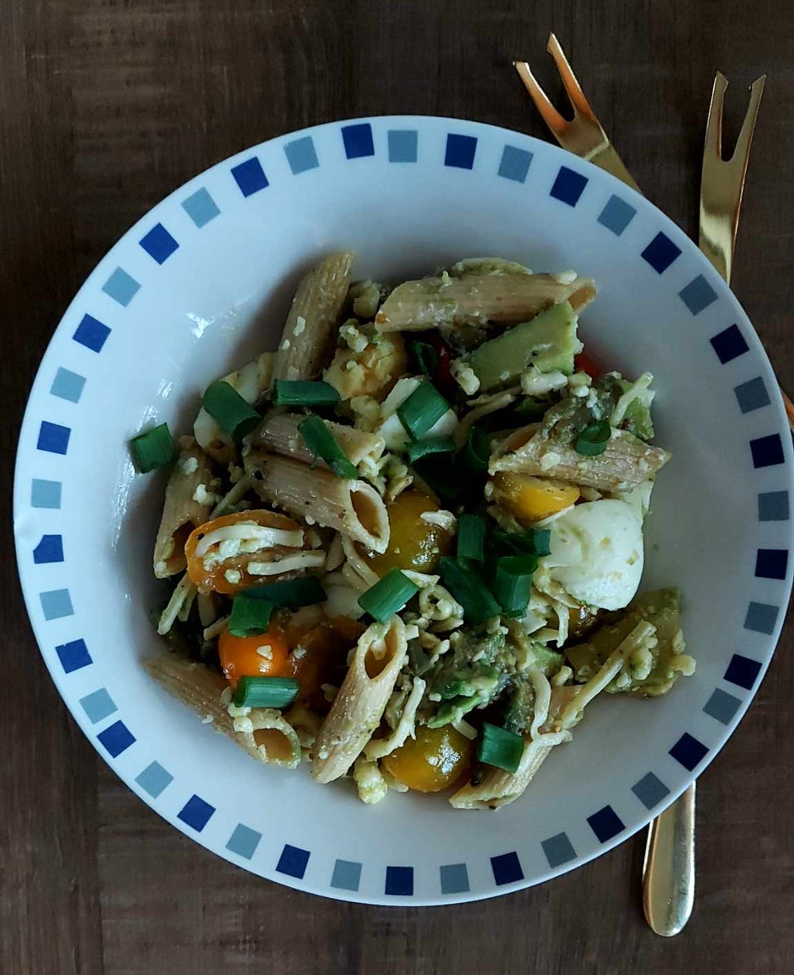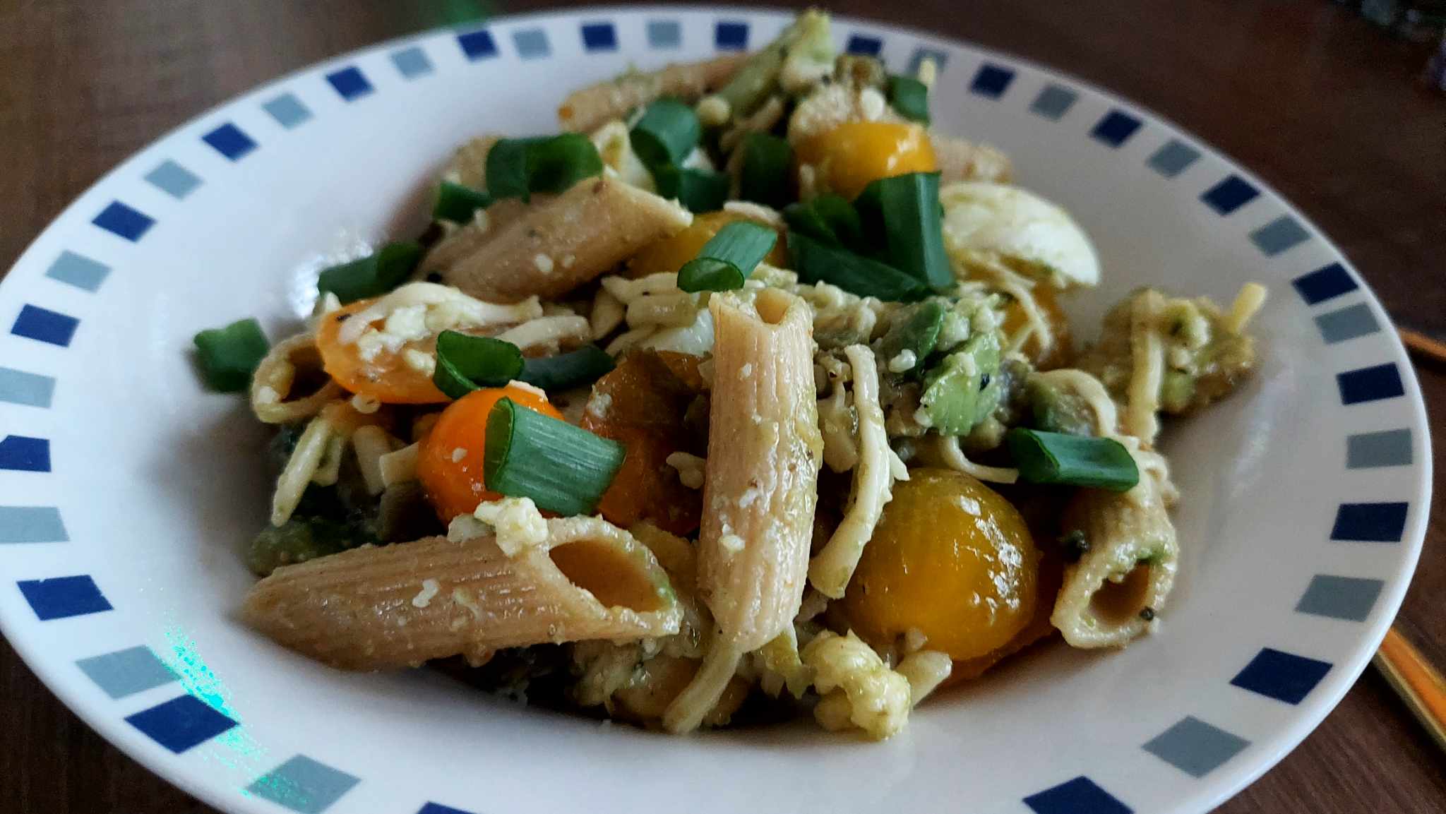 Ugotowany makaron mieszamy z brokułem, przeciętymi na pół pomidorkami i ćwiartkami ugotowanych jajek. Dodajemy sos, mieszamy.